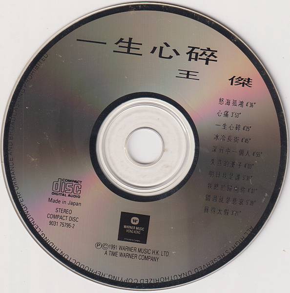 《一生心碎》是王傑於1991年發行的第五張粵語專輯。王傑的唱腔原本就有一種獨特非凡的哭腔,這再唱起粵語歌,那真的更加奇妙,聽過的人應該都知道我的意思。《一生心碎》收錄的曲目七成來自《忘記你不如忘記自己》的國語版,三成來自《為了愛夢一生》的國語版,兩張專輯都在1991年初發行,香港地區則等到年底才聽到了粵語版誕生。我很慶幸自己身處台灣,很多天王天后級的歌手,我可以很直接地原汁原味的好好欣賞,老實說,國語版的好聽些。這張CD挺意外地有日本版本,我總以為日本版回反映較高的行情,然而事實卻是,這張本土版,行情遠超過日本版,我深深誤會了。