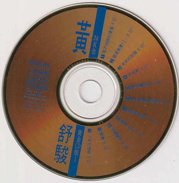 《24K黃金CD版》是歌林唱片為黃舒駿發行的一張精選專輯。歌林唱片在90年代初為不少旗下大牌歌手發行『24K黃金CD』,幾乎都以精選集方式出版,因此這算不算黃舒駿的官方精選集,恐怕得請教他本人是否認證。這張精選收錄黃舒駿八零年代的三張經典專輯《馬不停蹄的憂傷》《雁渡寒潭》《未來的街頭》的部分曲目,不但比例平均,而且我能想的到、聽過的主打次打歌,全都收錄其中,雖說這三張專輯的首版CD收藏指數高,難度低,不過如果你跟我一樣對黃舒駿的音樂不是那麼的偏愛、但又有點想接觸且並不排斥,這張黃金版的精選集,實在是CP值極高的一張收藏。